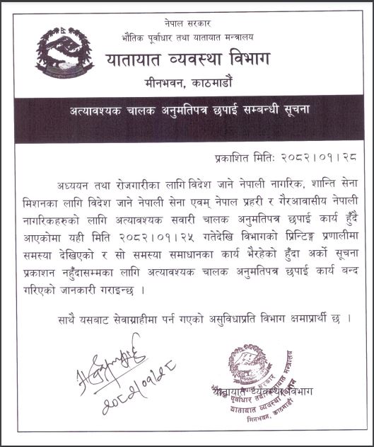 विभागले आइतबार एक सूचना जारी गर्दे २५ वैशाखदेखि प्रिन्टिङ प्रणालीमा समस्या आएका कारण अनिश्चितकालका लागि यो सेवा बन्द भएको जानकारी दिएको हो ।