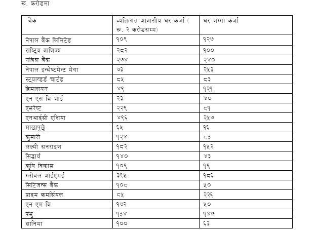यसैगरी बैंक तथा वित्तीय संस्थाबाट प्रवाहित घर जग्गा कर्जा ९ दशमलव ६२ प्रतिशतले बढेको छ । गत आवको ९ महिनामा २ खर्ब १४ अर्ब ४५ करोड रुपैयाँ घर जग्गा कर्जा प्रवाह भएको थियो भने चालू आवको सोही अवधिमा यस्तो कर्जा २ खर्ब ३५ अर्ब ८ करोड रुपैयाँ प्रवाह भएको तथ्याङ्क छ ।