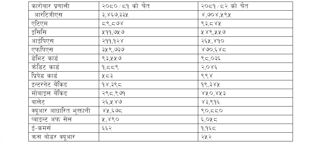 गत चैतमा सबैभन्दा धेरै भुक्तानी रियल टायम ग्रास सेटलमेन्ट (आरटिजीएस)मार्फत भएको छ । यो प्रणालीबाट ४७ खर्ब ४ अर्ब ५९ करोड रुपैयाँ कारोबार भएको छ । यो गतवर्षको यसै अवधिको तुलनामा ३५ दशमलव ६८ प्रतिशत बढी हो । गतवर्ष ३४ खर्ब ६७ अर्ब ३३ करोड रुपैयाँ भएको थियो । यसपछि इलेक्ट्रोनिक चेक क्लियरिङ (इसिसि)बाट ५ खर्ब ४९ अर्ब ५५ करोड, फास्टर पेमेन्ट सिस्टमबाट ४ खर्ब ७० अर्ब ६४ करोड र मोबाइल बैंकिङबाट ४ खर्ब ५० अर्ब ४५ करोड रुपैयाँ भुक्तानी भएको छ ।