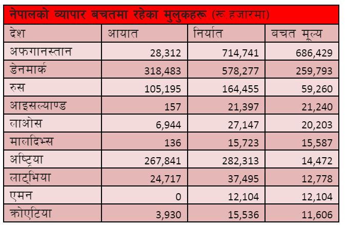 त्यस्तैनेपाल आइसल्याण्डसँग २ करोड १२ लाख, लाओससँग २ करोड २ लाख, मालदिभ्ससँग १ करोड ५८ लाख र अष्ट्रियासँग १ करोड ४४ लाख रुपैयाँ बराबरको व्यापार बचतमा रहेको तथ्याङ्कमा उल्लेख छ