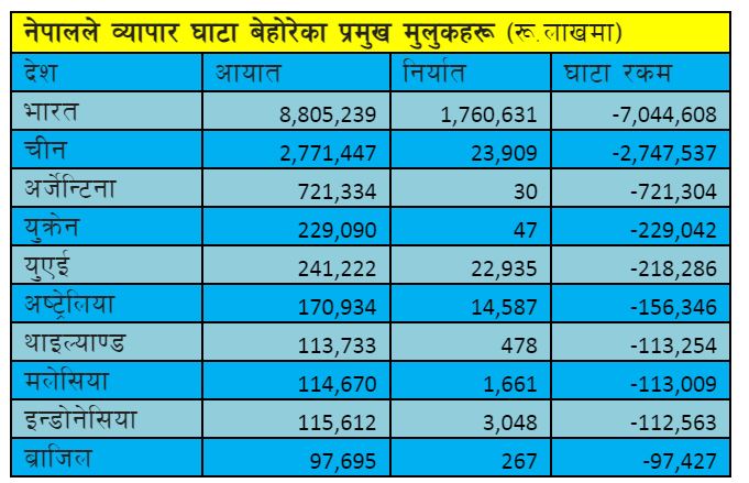 यसैगरी चालू आवको वैशाखसम्ममा १६३ मुलुकसँग व्यापार गरेको नेपालले १२८ सँग घाटा बेहोरेको छ । नेपालले बेहोरेको कुल व्यापार घाटामध्ये छिमेकी मुलक भारतसँग मात्रै ५६ दशमलव ०७ प्रतिशत रहेको छ । वैशाखसम्ममा नेपालले भारतबाट ८ खर्ब ८० अर्ब ५२ करोड मूल्य बराबरको वस्तु आयात गरेको छ भने भारततर्फ १ खर्ब ७६ अर्ब करोडको वस्तु निर्यात गरेको छ, अर्थात भारतसँग मात्रै नेपालले ७ खर्ब ४ अर्ब ४६ करोड रुपैयाँको व्यापार घाटा बेहोरेको छ ।