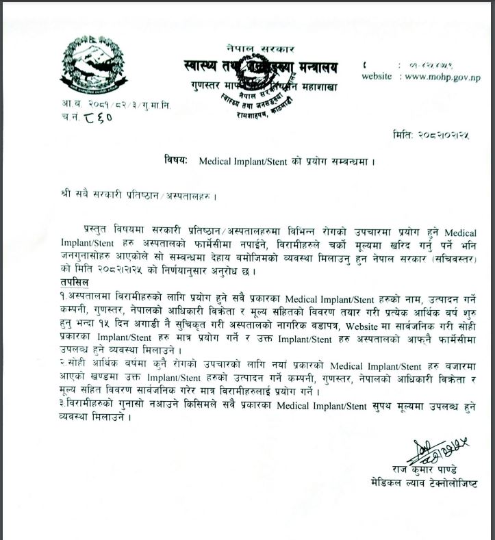 साथै बिक्रेताहरुलाई बढी मूल्य लिनबाट रोक्न सबै अस्पतालले आर्थिक वर्षमा कुनै रोगको प्रत्यारोपण, शल्यक्रिया तथा उपचारका लागि नयाँ खालको वस्तु आवश्यक परेमा कम्पनी, आधिकारिक विक्रेता तथा मूल्य सार्वजनिक गरेर मात्र बिरामीले प्राप्त गर्ने व्यवस्था मिलाउन समेत मन्त्रालयले पत्राचार गरेको छ ।