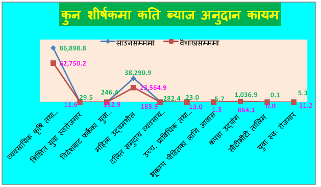 २०८१/८२ को वैशाखसम्म बजारमा कायम ब्याज अनुदान कर्जामध्ये सबैभन्दा बढी व्यवसायिक कृषि तथा पशुपन्छी क्षेत्रमा छ । यो क्षेत्रमा बजारमा कायम कुल अनुदानको ७१ दशमलव ६८ प्रतिशत अर्थात् ६२ अर्ब ७५ करोड रुपैयाँ छ । यसैगरी महिला उद्यमशीलतातर्फ २३ अर्ब ५६ करोड, कपडा उद्योगतर्फ ८६ करोड, दलित समुदायतर्फ १८ करोड र विदेशबाट फर्केका युवा परियोजनातर्फ १३ करोड रुपैयाँ ब्याज अनुदान कर्जा बजारमा कायम रहेको तथ्याङ्क छ ।