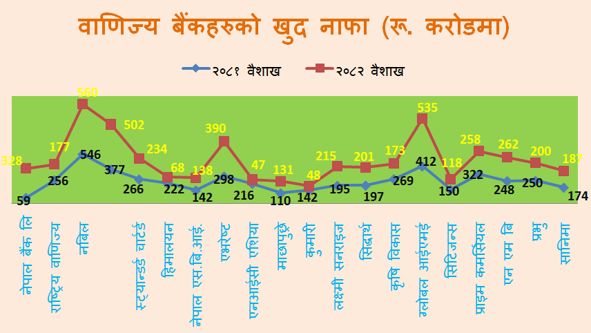 राष्ट्र बैंकको तथ्याङ्क हेर्दा गत आवको दश महिनाको तुलनामा चालू आवको सोही अवधिमा १० ओटा वाणिज्य बैंकको खुद नाफा बढेको छ भने १० ओटैमा ह्रास (कम नाफा) आएको छ । सो अवधिमा सबै भन्दा कम खुद नाफा गर्नेमा एनआईसी एशिया बैंक रहेको छ । बैंकले गत आवको वैशाखसम्ममा २ अर्ब १६ करोड खुद नाफा गरेको थियो भने चालू आवको सोही अवधिमा ४७ करोड रुपैयाँ नाफा गरेको छ । यस्तै कुमारी ४८ करोड, हिमालयन ६८ करोड र सिटिजन्स १ अर्ब १८ करोड रुपैयाँ खुद नाफा आर्जन गरेको तथ्याङ्क छ ।