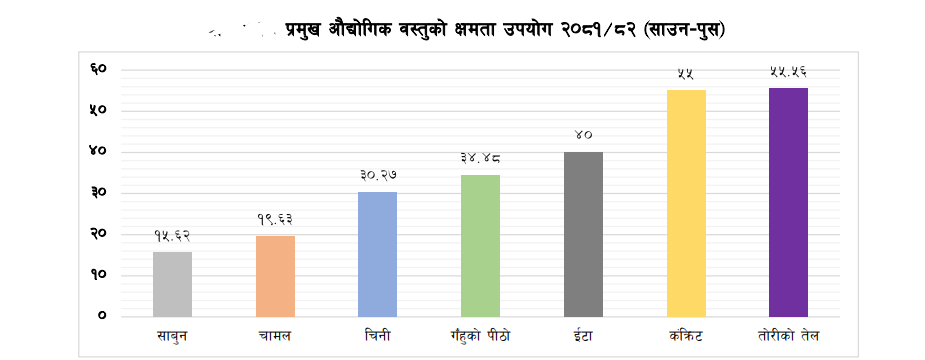 समीक्षा अवधिमा तोरीको तेल र कंक्रिट उत्पादन गर्ने उद्योगको तुलनात्मक रुपमा बढी क्षमता उपयोग भएको देखिएको छ । चामल, गहुँको पिठो, चिनी, साबुन र ईट्टाको उत्पादन गर्ने उद्योगको औसत क्षमता उपयोग भएको छ भने रोजिन उत्पादन गर्ने उद्योगको क्षमता उपयोग शुन्य रहेको छ ।