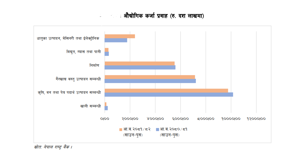 २०८१ पुस मसान्तसम्ममा बैंक तथा वित्तीय संस्थाहरुले औद्योगिक क्षेत्रमा प्रवाह गरेको कर्जामध्ये धातुका उत्पादन, मेसिनरी तथा ईलेक्ट्रोनिक सम्बन्धी कर्जा अघिल्लो आर्थिक वर्षको सोही अवधिको तुलनामा ३५ दशमलव ८५ प्रतिशतले वृद्धि भएको छ भने खानी सम्बन्धी कर्जामा ४० दशमलव ३४ प्रतिशतले ह्रास आएको छ ।