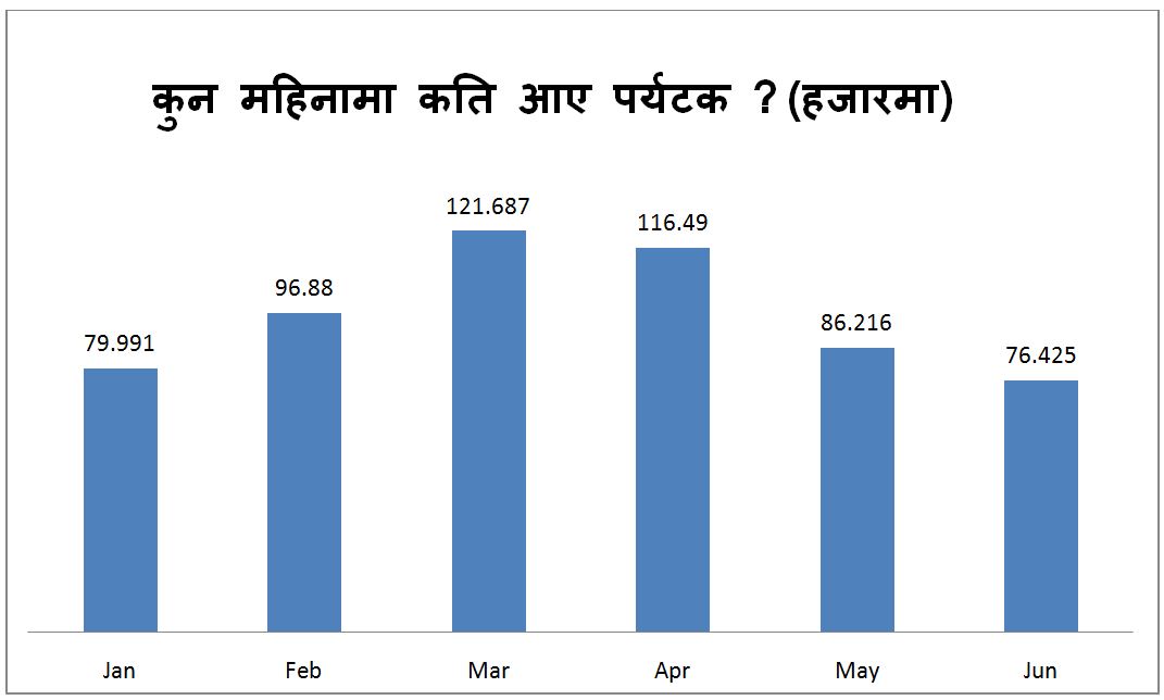 काठमाडौं, १८ असार । यस वर्षको पहिलो ६ महिना नेपालमा पौने ६ लाख पर्यटक नेपाल घुम्न आएका छन् ।
