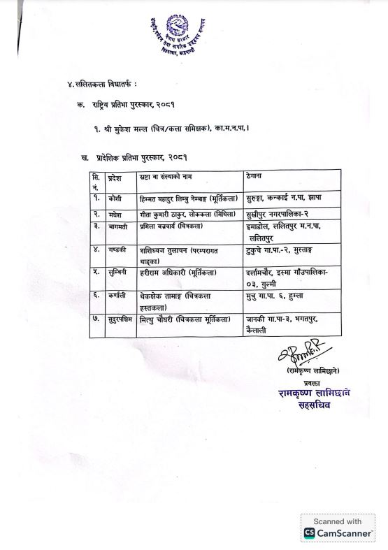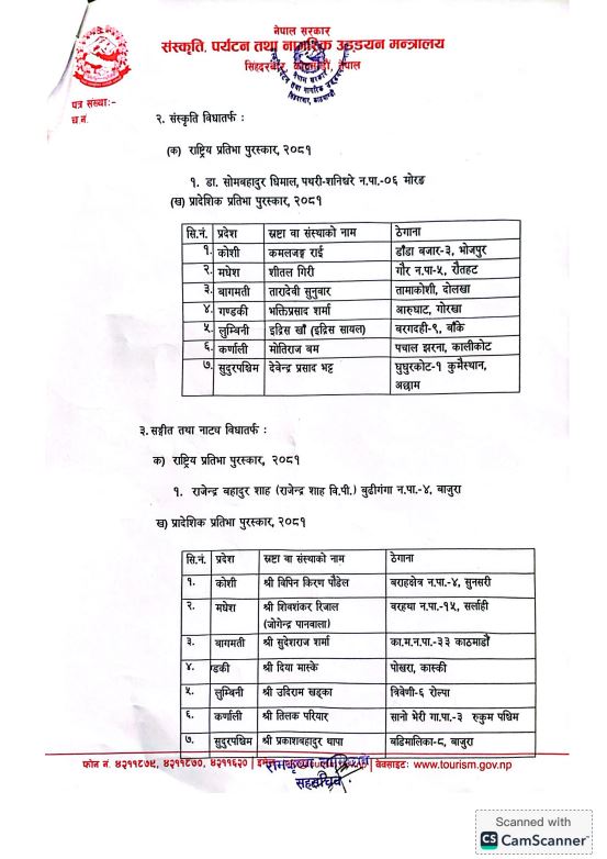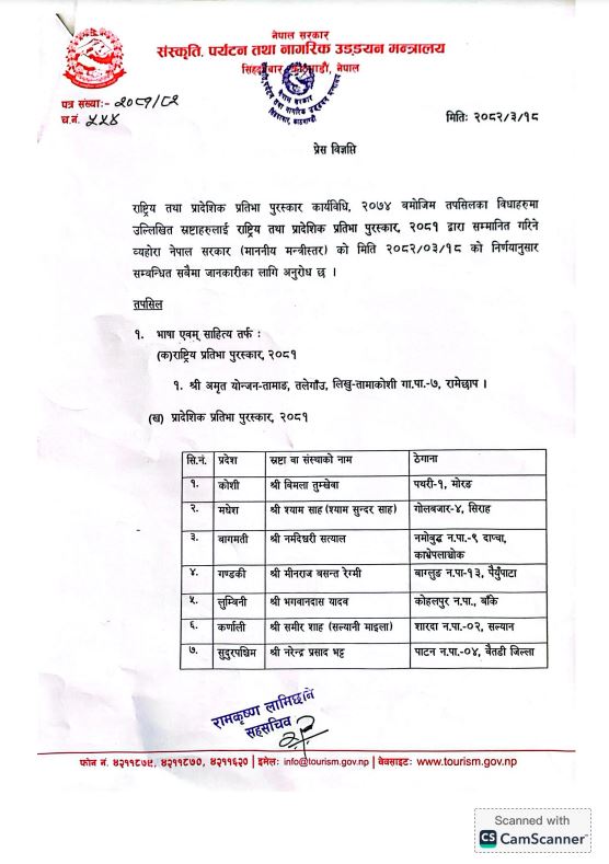 मन्त्रालयले एक सूचना जारी गर्दै भाषा एवं साहित्य, संस्कृति, सङ्गीत तथा नाट्य र ललितकला विधाको राष्ट्रिय तथा प्रादेशिक पुरस्कार पाउने व्यक्तिको नाम घोषणा गरेको हो । हरेक वर्ष प्रदान गरिने राष्ट्रिय प्रतिभा तथा प्रदेश प्रतिभा पुरस्कार २०८१ का लागि बुधबारको मन्त्रीस्तरीय निर्णयबाट नाम छनोट गरिएको हो ।