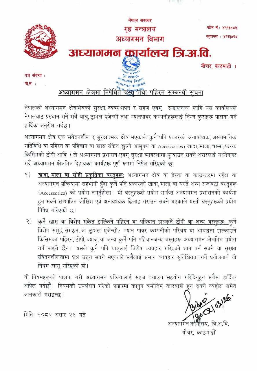 त्रिभुवन अन्तर्राष्ट्रिय विमानस्थलस्थित अध्यागमन कार्यालयले आज एक सूचना जारी गर्दै अध्यागमन क्षेत्र एक संवेदनशील र सुरक्षात्मक क्षेत्र भएकाले यस्ता सामग्रीको प्रयोगमा रोक लगाइएको जनाएको छ ।