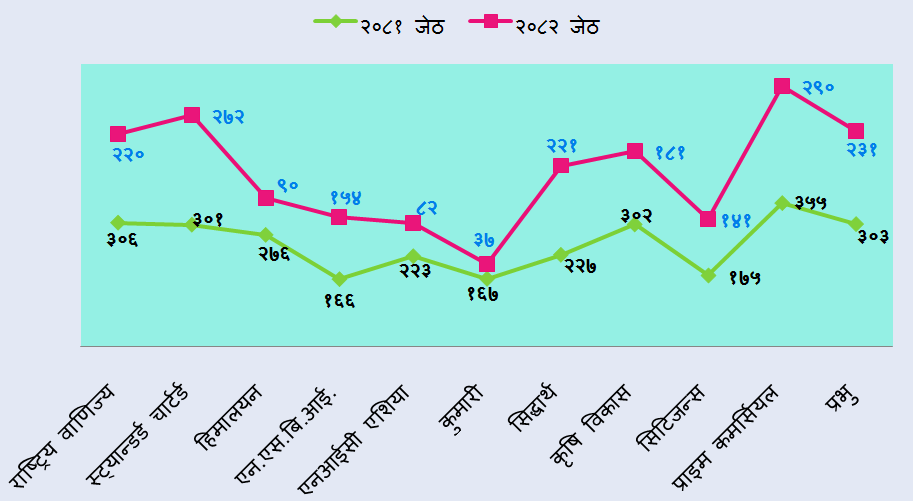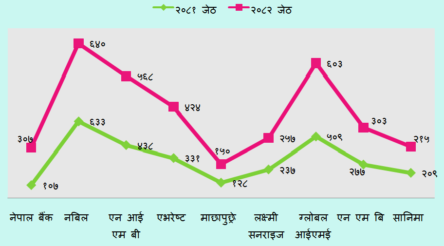 नेपाल राष्ट्र बैंकको तथ्याङ्क अनुसार गत आवको ११ महिनाको तुलनामा चालू आवको सोही अवधिमा यस्तो बैंकको खुद नाफा ४ दशमलव ९६ प्रतिशत घटेकोे हो । गत जेठसम्ममा बैंकहरूको खुद नाफा ५३ अर्ब ९७ करोड रुपैयाँ रहेको छ । गत आवको यसै अवधिमा ५६ अर्ब ७९ करोड रुपैयाँ खुद नाफा आर्जन गरेका थिए ।