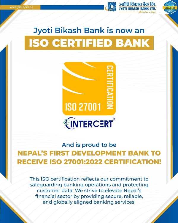 काठमाडौं, २ साउन । ज्योति विकास बैंकले सूचना सुरक्षा व्यवस्थापन प्रणालीमा अन्तर्राष्ट्रिय मान्यता प्राप्त ‘ISO 27001:2022’ प्रमाणपत्र प्राप्त गरेको छ । यस सँगै ‘ISO 27001:2022’ प्रमाणपत्र प्राप्त गर्ने नेपालको पहिलो विकास बैंकको रूपमा ज्योति विकास बैंकले ऐतिहासिक उपलब्धि हासिल गरेको हो ।