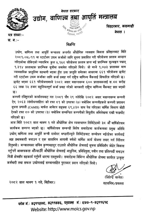 मन्त्रालय अन्तर्गतको औद्योगिक व्यवसाय विकास प्रतिष्ठानले २०८१ भदौ ११ गते स्टार्टअप उद्यम कर्जाका लागि परियोजना प्रस्ताव आह्वान गरेको थियो । तोकिएको समयभित्र कुल ५ हजार १५८ परियोजना प्रस्ताव प्राप्त भएकोमा प्रारम्भिक मूल्यांकनपछि १ हजार ३१४ प्रस्तावलाई सूचीमा समावेश गरिएको थियो ।