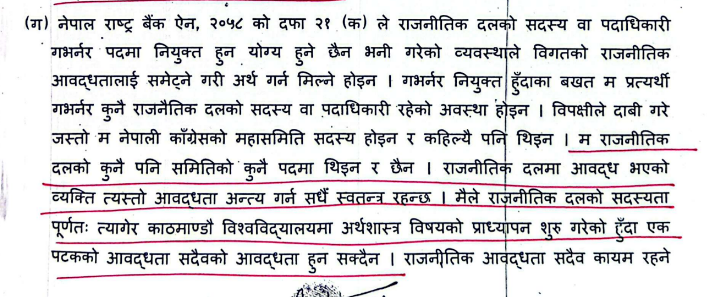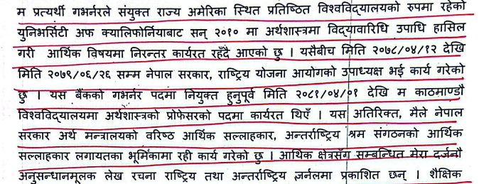 ‘शैक्षिक योग्यताका सम्बन्धमा विपक्षी निवेदक स्वयंले समेत निवेदनपत्रमा अर्थशास्त्रमा विद्यावारिधिको उपाधि हासिल गरेको व्यहोरा उल्लेख गरेकामा राष्ट्र बैंक ऐन, २०५८ को दफा १५ ले खोजेको विज्ञता नरहेको भनी लिएको दाबी विरोधाभाषपूर्ण छ,’ उनको लिखित जवाफमा भनिएको छ, ‘प्रचलित कानुनी व्यवस्थाले तोकिदिएको स्नातकोत्तर उपाधिभन्दा माथिल्लो विद्यावारिधिको उपाधिले अयोग्यता सिर्जना गर्ने होइन ।’
