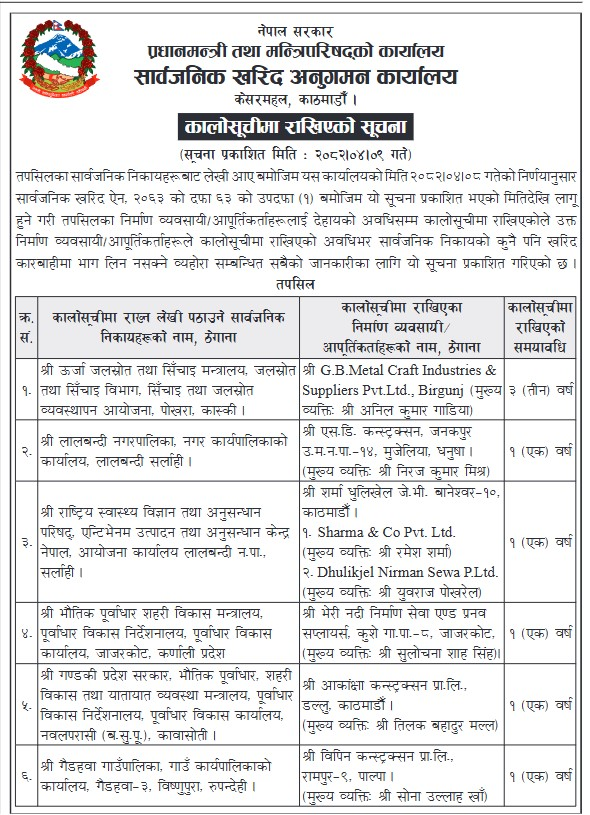 कार्यालयले आज सूचना जारी गर्दै विभिन्न निकायबाट कालो सूचीमा राख्नको लागि लेखि पठाएअनुसार ती निर्माण कम्पनीलाई कालो सूचीमा राखिएको कार्यालयले जानकारी दिएको हो ।