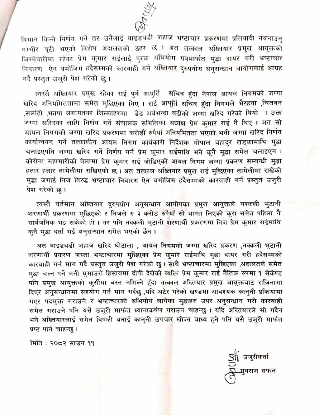 त्यस्तै उनले नेपाल आयल निगमको जग्गा खरिद प्रकरणको पनि अनुसन्धान हुनुपर्ने माग गरेका छन् । ‘तत्कालीन नेपाल वायुसेवा निगमको अध्यक्षको रुपमा बसेको बैठकबाट नै वाइडबडी खरिदको प्रक्रिया अगाडि बढेको प्रमाणहरुसमेत सार्वजनिक भई सकेका छन् । तत्कालीन संस्कृति, पर्यटन तथा नागरिक उड्डयन मन्त्रालयका सचिव एवम् नेपाल वायुसेवा निगम संचालक समितिको अध्यक्षको हैसियतमा विमान किन्ने निर्णय गर्ने तर उनैलाई वाइडबडी जहाज भ्रष्टाचार प्रकरणमा प्रतिवादी नबनाउनु गम्भीर त्रुटी भएको विशेष अदालतको ठहर छ,’ उजुरीमा भनिएको छ ।