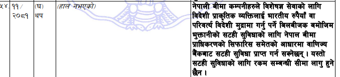 नयाँ नियमअनुसार बीमा कम्पनीहरूले एक्चुअरी, मूल्यांकन वा सर्वेक्षण जस्ता प्राविधिक सेवाका लागि भारतका व्यक्तिगत विज्ञहरूलाई भुक्तानी गर्दा नेपाल बीमा प्राधिकरणको सिफारिसमा सिधै वाणिज्य बैंकमार्फत सटही सुविधा प्राप्त गर्न सक्छन् । यसले बीमा कम्पनीहरूको प्राविधिक सेवा खरिद प्रक्रिया सहज हुने अपेक्षा गरिएको छ ।