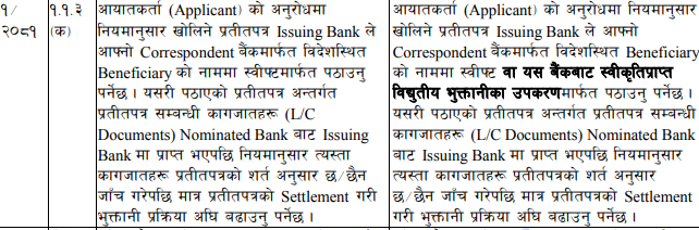 यसका साथै राष्ट्र बैंकले आयात प्रक्रिया पनि परिमार्जन गरेको छ । अबदेखि आयातकर्ताले खोल्ने प्रतीतपत्र (एल/सी) अन्तर्गत विदेशी लाभग्राहीलाई भुक्तानी गर्दा सम्बन्धित बैंकले आफ्नै कर्पोरेसन बैंक प्रयोग गरी रकम विद्युतीय माध्यमबाट पठाउनुपर्नेछ ।