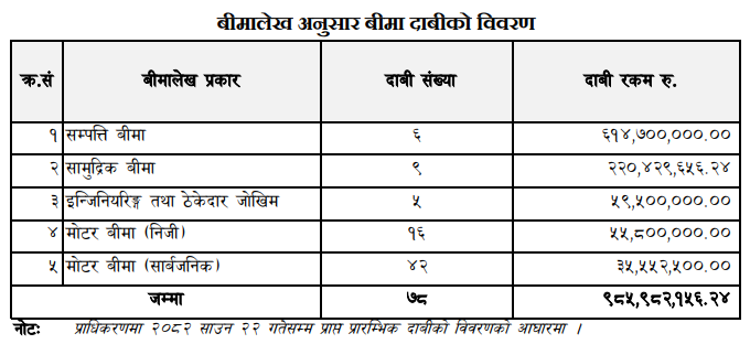 नेपाल बीमा प्राधिकरणका अनुसार कुल ७८ वटा बीमा दाबी दर्ता भएका छन् । दाबीमध्ये सम्पत्ति बीमा सबैभन्दा बढी छ भने सामुद्रिक बीमा ९, इञ्जिनियरिङ तथा ठेकेदार जोखिम ५, मोटर बीमा (निजी) १६ र मोटर बीमा (सार्वजनिक) ४२ वटा छन् ।