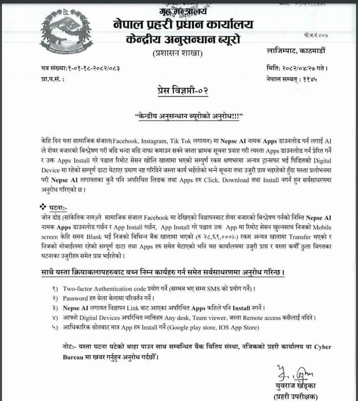 काठमाडौं, २७ साउन । नेपाल प्रहरीको केन्द्रीय अनुसन्धान ब्युरो (सीआईबी) ले हाल ‘नेप्से एआई’ नामक एप प्रयोग गरी शेयर बजारको विश्लेषणको बहानामा ठगी गर्ने घटना बढिरहेको भन्दै सर्वसाधारणलाई सतर्क रहन आग्रह गरेको छ ।