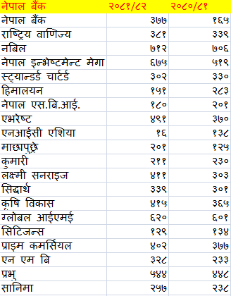 राष्ट्र बैंकको तथ्याङ्क हेर्दा अघिल्लो आवको तुलनामा गत आवको सोही अवधिमा १४ ओटा वाणिज्य बैंकको खुद नाफा बढेको छ भने ६ ओटामा ह्रास (कम नाफा) आएको छ । सो अवधिमा सबै भन्दा कम खुद नाफा गर्नेमा एनआईसी एशिया बैंक रहेको छ । बैंकले २०८१ को असारसम्ममा १ अर्ब ३८ करोड खुद नाफा गरेको थियो भने गत आवको सोही अवधिमा १६ करोड रुपैयाँ नाफा गरेको छ ।