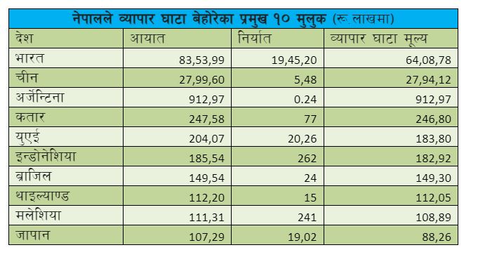 नेपालले व्यापार घाटा बेहोरेको मुलुकमध्ये तेस्रोमा अर्जेन्टिना रहेको छ । चालू आवको साउनमा नेपालले अर्जेन्टिनाबाट ९ अर्ब १२ करोड मूल्य बराबरको वस्तु आयात गर्दा २४ हजारको मात्रै निर्यात गरेको छ । त्यस्तै कतारसँग नेपाल २ अर्ब ६ करोडले व्यापार घाटामा छ ।