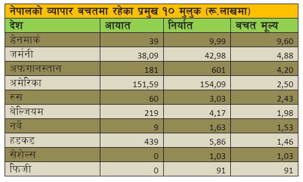 उल्लेख छ । चालू आवको पहिलो महिना साउनमा नेपाल सबैभन्दा बढी बचतमा डेनमार्कसँग छ । सो अवधिमा नेपाल डेनमार्कसँग ९ करोड ६० लाखभन्दा बढीको बचतमा छ । यस अवधिमा नेपालले डेनमार्कतर्फ ९ करोड ९९ लाख मूल्य बराबरको वस्तु निर्यात गरेको छ भने ३९ रुपैयाँको मात्रै वस्तु आयात गरेको छ ।
