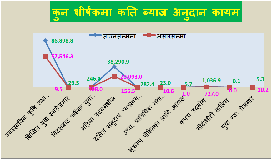 २०८१/८२ मा बजारमा कायम ब्याज अनुदान कर्जामध्ये सबैभन्दा बढी व्यवसायिक कृषि तथा पशुपन्छी क्षेत्रमा छ । यो क्षेत्रमा बजारमा कायम कुल अनुदानको ७३ दशमलव १५ प्रतिशत अर्थात् ५७ अर्ब ५४ करोड रुपैयाँ छ । यसैगरी महिला उद्यमशीलतातर्फ २० अर्ब ९ करोड, कपडा उद्योगतर्फ ७२ करोड, दलित समुदायतर्फ १५ करोड र विदेशबाट फर्केका युवा परियोजनातर्फ १० करोड रुपैयाँ ब्याज अनुदान कर्जा बजारमा कायम रहेको तथ्याङ्क छ ।