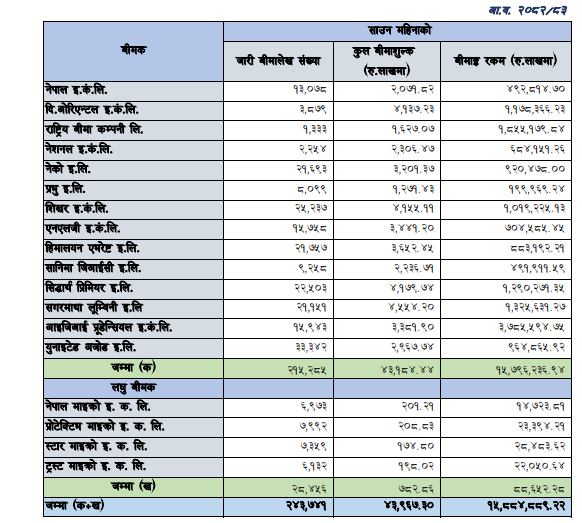 सो अवधिमा सबैभन्दा बढी सगरमाथा लुम्बिनी इन्स्योरेन्सले ४५ करोड ५४ लाख, सिद्धार्थ प्रिमियरले ४१ करोड ७९ लाख र शिखर इन्स्योरेन्सले ४१ करोड ५५ लाख रुपियाँ कूल बीमाशुल्क संकलन गरेको छ ।