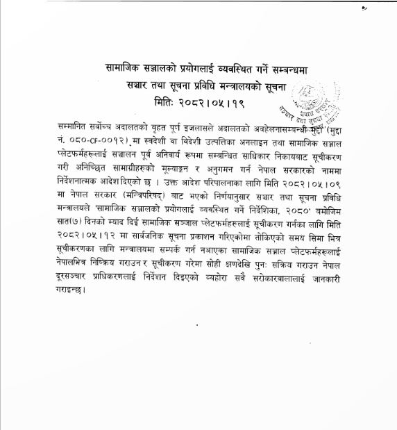 ‘सम्मानित सर्वोच्च अदालतको बृहत पूर्ण इजलासले अदालतको अवहेलनासम्बन्धी मुद्दा (मुद्दा नं. ०८०–ऋँ–००१२) मा स्वदेशी वा विदेशी उत्पत्तिका अनलाइन तथा सामाजिक सञ्जाल प्लेटफर्महरूलाई सञ्चालन पूर्व अनिवार्य रूपमा सम्बन्धित साधिकार निकायबाट सूचीकरण गरी अनिच्छित सामाग्रीहरुको मूल्याङ्कन र अनुगमन गर्न नेपाल सरकारको नाममा निर्देशनात्मक आदेश दिएको छ । उक्त आदेश परिपालनाका लागि मिति २०८२।०५।०९ मा नेपाल सरकार (मन्त्रिपरिषद्) बाट भएको निर्णयानुसार सञ्चार तथा सूचना प्रविधि मन्त्रालयले ‘सामाजिक सञ्जालको प्रयोगलाई व्यवस्थित गर्ने निर्देशिका, २०८०’ बमोजिम सात (७) दिनको म्याद दिई सामाजिक सञ्जाल प्लेटफर्महरुलाई सूचीकरण गर्नका लागि मिति २०८२।०५।१२ मा सार्वजनिक सूचना प्रकाशन गरिएकोमा तोकिएको समय सिमा भित्र सूचीकरणका लागि मन्त्रालयमा सम्पर्क गर्न नआएका सामाजिक सञ्जाल प्लेटफर्महरूलाई नेपालभित्र निष्क्रिय गराउन र सूचीकरण गरेमा सोही क्षणदेखि पुनः सक्रिय गराउन नेपाल दूरसञ्चार प्राधिकरणलाई निर्देशन दिइएको व्यहोरा सवै सरोकारवालालाई जानकारी गराइन्छ,’ सूचनामा भनिएको छ ।