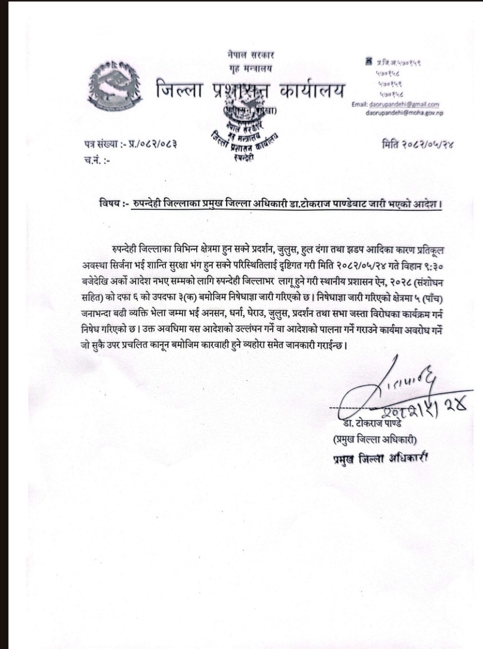 काठमाडौं, २४ भदौ । रुपन्देही प्रशासनले आज पनि कफ्र्यू आदेश जारी गरेको छ ।