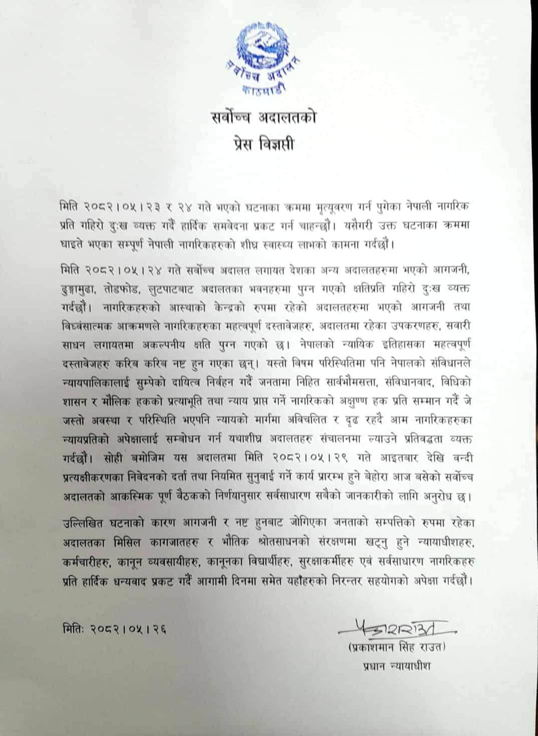 नेपालको न्यायिक इतिहासका महत्वपूर्ण दस्तावेजहरु करिब करिब नष्ट हुन गएको विज्ञप्तिमा जनाइएको छ । ‘यस्तो विषम परिस्थितिमा पनि नेपालको संविधानले न्यायपालिकालाई सुम्पेको दायित्व निर्वहन गर्दै जनतामा निहित सार्वभौमसत्ता, संविधानवाद, विधिको शासन र मौलिक हकको प्रत्याभूति तथा न्याय प्राप्त गर्ने नागरिकको अक्षुण्ण हक प्रति सम्मान गर्दै जे जस्तो अवस्था र परिस्थिति भएपनि न्यायको मार्गमा अविचलित र दृढ रहदै आम नागरिकहरुका न्यायप्रतिको अपेक्षालाई सम्बोधन गर्न यथाशीघ्र अदालतहरु संचालनमा ल्याउने प्रतिवद्धता व्यक्त गर्दछौं,’ विज्ञप्तिमा भनिएको छ ।