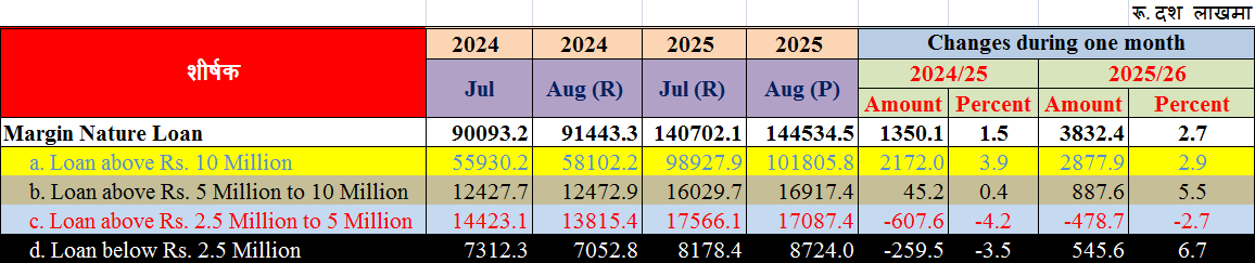 गत साउनमा मार्जिन प्रकृतिको कर्जामा २५ लाखभन्दा कम कर्जा लिने सबैभन्दा बढी बढेका छन् । सो अवधिमा २५ लाख भन्दा कम कर्जा लिनेहरू ६ दशमलव ७ प्रतिशत, ५० लाखदेखि १ करोडसम्मको कर्जा लिनेहरू ५ दशमलव ५ प्रतिशतले बढेको छ भने १ करोड भन्दा बढी कर्जा लिने २ दशमलव ९ प्रतिशत र २५ लाखदेखि ५० लाखसम्म कर्जा लिनेहरू २ दशमलव ७ प्रतिशतले बढेको छ ।
