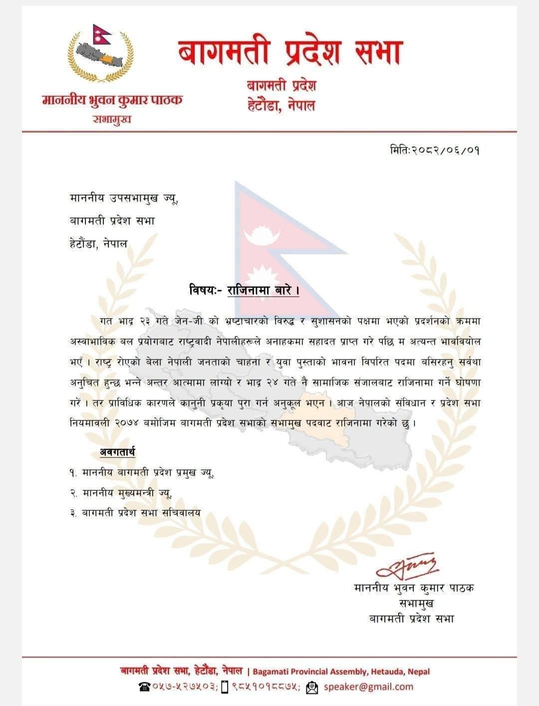 काठमाडौं, १ असोज । बागमती प्रदेशसभाका सभामुख भुवनकुमार पाठकले राजीनामा दिएका छन् ।