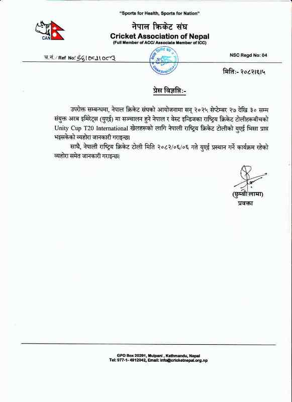 नेपालले २७, २९ र ३० सेप्टेम्बरमा तीनवटा टी २० म्याच वेस्ट इन्डिजसँग खेल्नेछ । प्रतियोगिताको सबै खर्च र व्यवस्थापन नेपाल क्रिकेट संघले गर्ने जनाएको छ ।