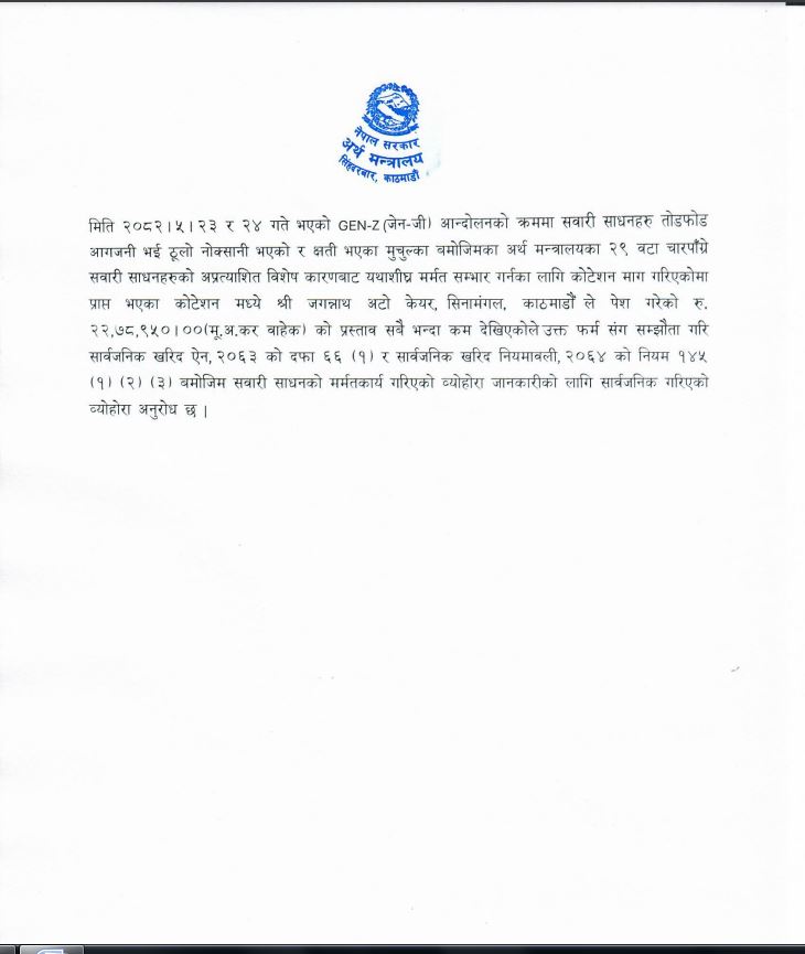 काठमाडौं, १२ असोज । अर्थ मन्त्रालयले जेनजी युवा आन्दोलनका क्रममा जलाइएका २९ वटा सवारी साधनको मर्मत सम्भार गरेको छ । मर्मतमा झण्डै २३ लाख खर्च भएको छ ।
