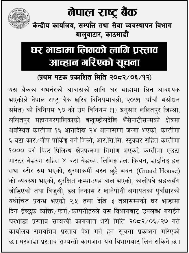 घर भाडामा दिन इच्छुक व्यक्ति तथा कम्पनीले असोज २७ गतेभित्र प्रस्ताव पेस गर्न राष्ट्र बैंकले भनेको छ ।