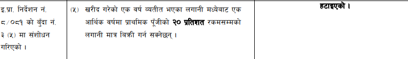 पहिलो प्रावधान अनुसार बैंक तथा वित्तीय संस्थाहरूले एक आर्थिक वर्षमा आफ्ना कुल प्राथमिक पूँजीको अधिकतम २० प्रतिशत बराबर मात्र लगानी बिक्री गर्न पाउने व्यवस्था थियो । साथै बिक्री गर्न लागिएको लगानी कम्तीमा एक वर्षसम्म आफ्नो स्वामित्वमा रहनुपर्ने नियम पनि लागू थियो ।