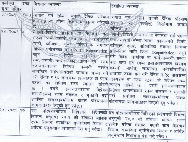 त्यस्तै संशोधन अनुसार अब नेपाली वा विदेशी नागरिक, नेपालमा दर्ता भएका फर्म, कम्पनी, संस्था वा शाखा कार्यालयहरूले बिक्री, कमिसन, शुल्क, पारिश्रमिकलगायत फिर्ता नहुने प्रयोजनका लागि विदेशबाट प्राप्त रकम इजाजतप्राप्त विप्रेषण कम्पनीमार्फत लाभग्राहीको खातामा जम्मा गर्न सक्नेछन् । यसअन्तर्गत ल्याउन सकिने रकमको सीमा दैनिक २५ लाख रुपैयाँसम्म पु¥याइएको छ, जुन यसअघि २० लाख रुपैयाँ मात्र थियो ।