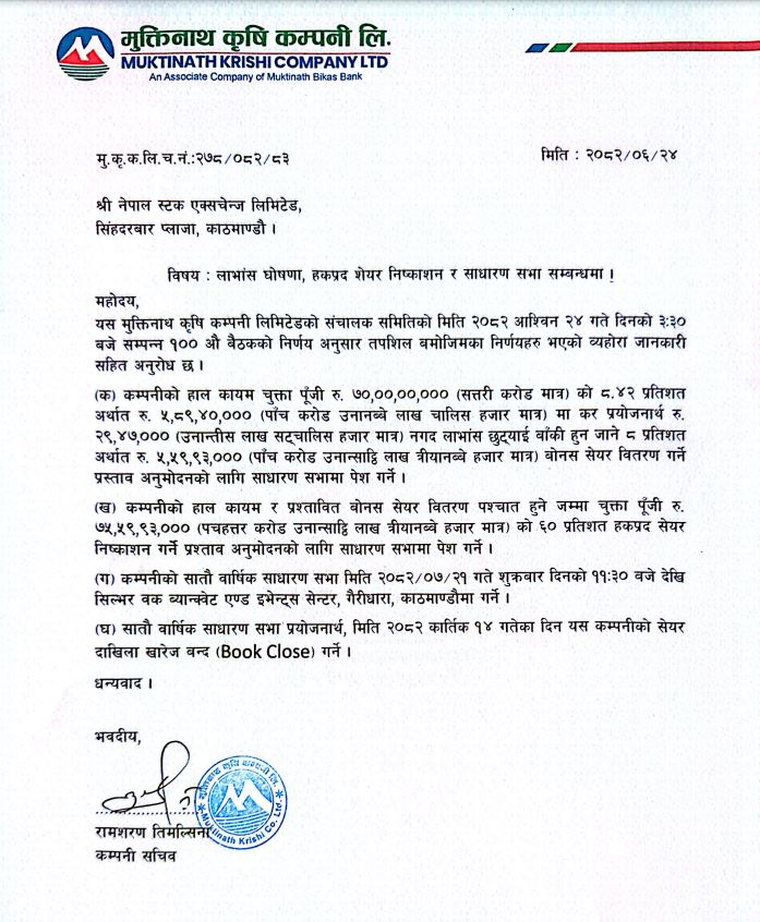 मुक्तिनाथ कृषि कम्पनीले ८% बोनस शेयर दिएपछि हकप्रसद निष्कासन गर्ने, साधारणसभा पनि आह्वान
