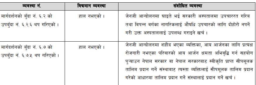 बैंक तथा वित्तीय संस्थाले आफ्नो मुनाफाको एक प्रतिशत बराबरको रकम अनिवार्य रूपमा सामाजिक उत्तरदायित्वमा खर्च गर्नुपर्नेछ । केन्द्रीय बैंकको संशोधन अनुसार जेनजी आन्दोलनमा घाइते भएका गरिब तथा विपन्न नागरिकलाई सरकारी अस्पतालमा उपचारका लागि आवश्यक औषधि र सेवामा खर्च गर्न सकिनेछ । साथै सहिद भएका व्यक्तिका परिवारका लागि आय आर्जन क्षमता बढाउने उद्देश्यले नेपाल सरकार वा सरकारी स्वीकृत सीपमूलक तालिम दिने संस्थाबाट तालिम प्रदान गर्न खर्च गर्न सकिने व्यवस्था पनि गरिएको छ ।