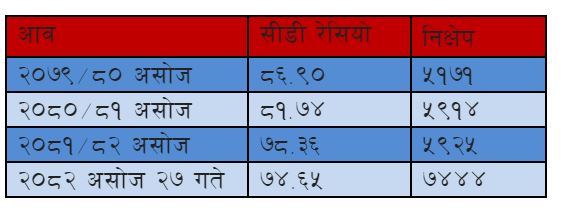 असोज २७ सम्म बैंक तथा वित्तीय संस्थामा कुल निक्षेप ७४ खर्ब ४४ अर्ब रुपैयाँ छ । सोही अवधिमा बैंक तथा वित्तीय संस्थाको कर्जा निक्षेप अनुपात (सीडी रेसियो) ७४.६५ प्रतिशत छ । राष्ट्र बैंकको निर्देशनअनुसार बैंक तथा वित्तीय संस्थाले कुल निक्षेपको बढीमा ९० प्रतिशतसम्म ऋण दिन पाउँछन् । २०७९/८० मा सीडी रेसियो ८६ दशमलव ९० प्रतिशत रहेकोमा हाल यो ७४ प्रतिशतमा झरेको छ ।
