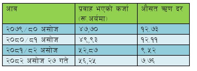 चालू आवको असोज २७ सम्ममा बैंक, वित्तबाट निजीक्षेत्रमा ५६ खर्ब २५ अर्ब कर्जा प्रवाह भएको छ । जुन तीन वर्ष अघिको तुलनामा १७ दशमलव ९२ प्रतिशत मात्र बढी हो । आव २०७९/८० को ६ महिनामा बैंक तथा वित्तीय संस्थाले ४७ खर्ब ७० करोड रुपैयाँ कर्जा प्रवाह गरेका थिए ।