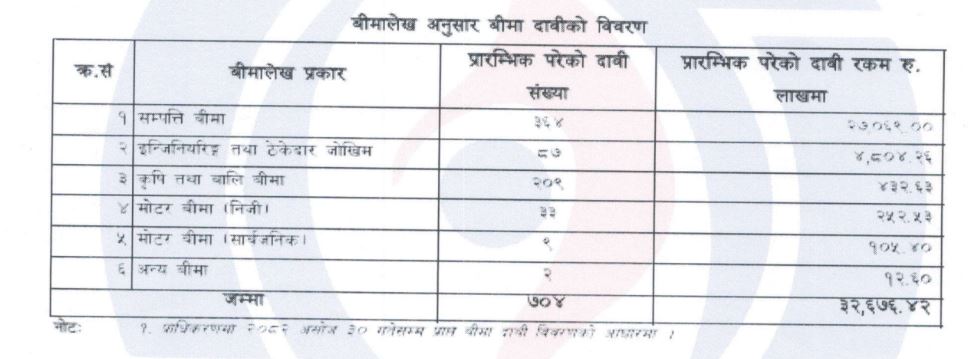 विभिन्न १३ वटा निर्जीवन बीमा कम्पनी र २ वटा लघु निर्जीवन बीमा कम्पनीमा परेका कूल ७०४ वटा बीमा दाबीको करिव ३ अर्ब २६ करोड ७६ लाख दाबी परेको जानकारी निर्जीवन बीमा कम्पनीहरूबाट प्राप्त भएको प्राधिकरणले जनाएको छ ।