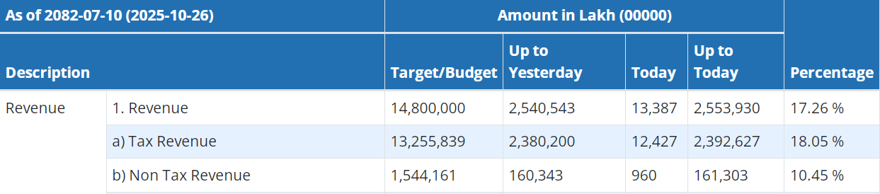 यस्तै कात्तिक १० गतेसम्म कर राजस्वतर्फ १८ दशमलव ०५ प्रतिशत अर्थात २ अर्ब ३९ अर्ब २६ करोड २७ लाख र गैरकर राजस्वतर्फ १० दशमलव ४५ प्रतिशत अर्थात १६ अर्ब १३ करोड ३ लाख रुपैयाँ संकलन भएको छ ।