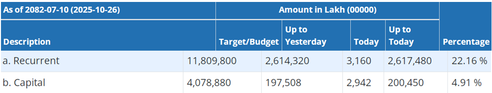 महालेखा नियन्त्रक कार्यालयका अनुसार आवको कात्तिक १० गतेसम्म सरकारको विकास खर्च २० अर्ब ४ करोड ५० लाख रुपैयाँ मात्र भएको छ, जुन वार्षिक बजेट विनियोजनको ४ दशमलव ९१ प्रतिशत हो । यो गत वर्षको यसै अवधिको तुलनामा ४ दशमलव ०६ प्रतिशत बिन्दुले कमी हो । सो वर्षको कात्तिक १० गतेसम्ममा यस्तो खर्च ८ दशमलव ६७ प्रतिशत अर्थात ३० अर्ब ५४ करोड ७ लाख रुपैयाँ भएको थियो ।