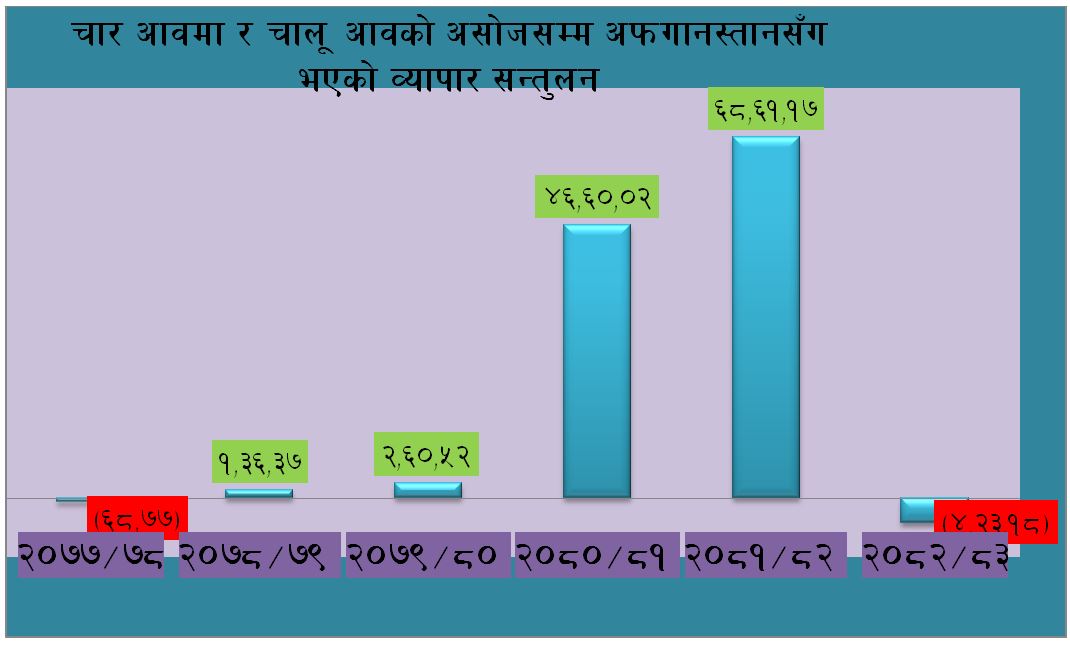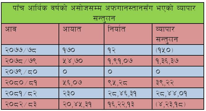 आव २०७७/७८ को असोजसम्ममा अफगानिस्तानसँग डेढ लाख रुपैयाँको घाटामा रहेको नेपालको व्यापार चार वर्षयता लगातार बचतमा थियो ।