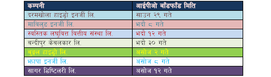 सूचीकृत हुन बाँकी कम्पनीहरूमा दरमखोला हाइड्रो इनर्जी लिमिटेड (लि), माविलुङ इनर्जी लि, स्वस्तिक लघुवित्त वित्तीय संस्था लि, बन्दीपुर केबलकार लि, बुङ्गल हाइड्रो लि, झापा इनर्जी र सागर डिष्टिलरी लि रहेका छन् ।