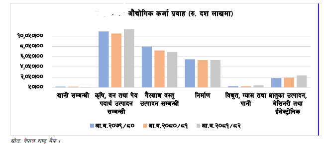 गत वर्षको सोही अवधिमा यस्तो कर्जा ४ दशमलव ७९ प्रतिशतले कमी आएको थियो । कुल प्रवाहित कर्जामध्ये औद्योगिक क्षेत्रमा प्रवाहित भएको कर्जाको अंश १६ दशमलव ९७ प्रतिशत रहेको छ ।