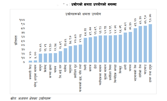 गत आवमा सबैभन्दा बढी क्षमता उपयोग गर्ने उद्योगहरू क्रमशः टायर तथा ट्यूव, चाउचाउ, तोरीको तेल, र भटमासको तेल उत्पादन गर्ने समूहका उद्योगहरू रहेका छन्भने कम क्षमता उपयोग गर्ने उद्योगहरू वनस्पति घिउ, घरेलु धातुका सामान, साबुन, सिमेन्ट, कच्चा छाला र चामल उत्पादन गर्ने समूहका उद्योगहरू रहेका छन् ।