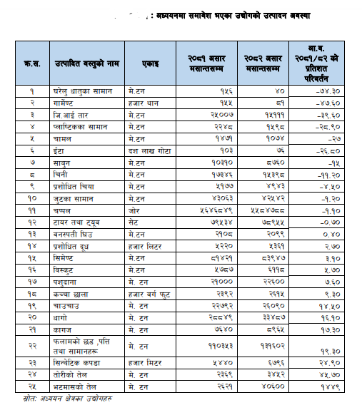 यस अध्ययनमा समेटिएका कोशी प्रदेशका ४३ वटा उद्योगहरूमा आव २०८०/८१ को तुलनामा गत आव २०८१/८२ मा भटमासको तेलको उत्पादन सबैभन्दा बढी १४४९ प्रतिशतले बढेको छ भने घरेलु धातुका सामानको उत्पादन ७४ दशमलव ३ प्रतिशतले घटेको छ ।